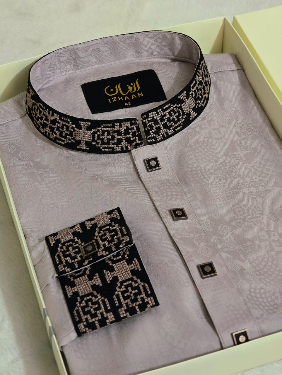 • Breathtaking embroidery embellishing the collar, upper chest, and cuffs