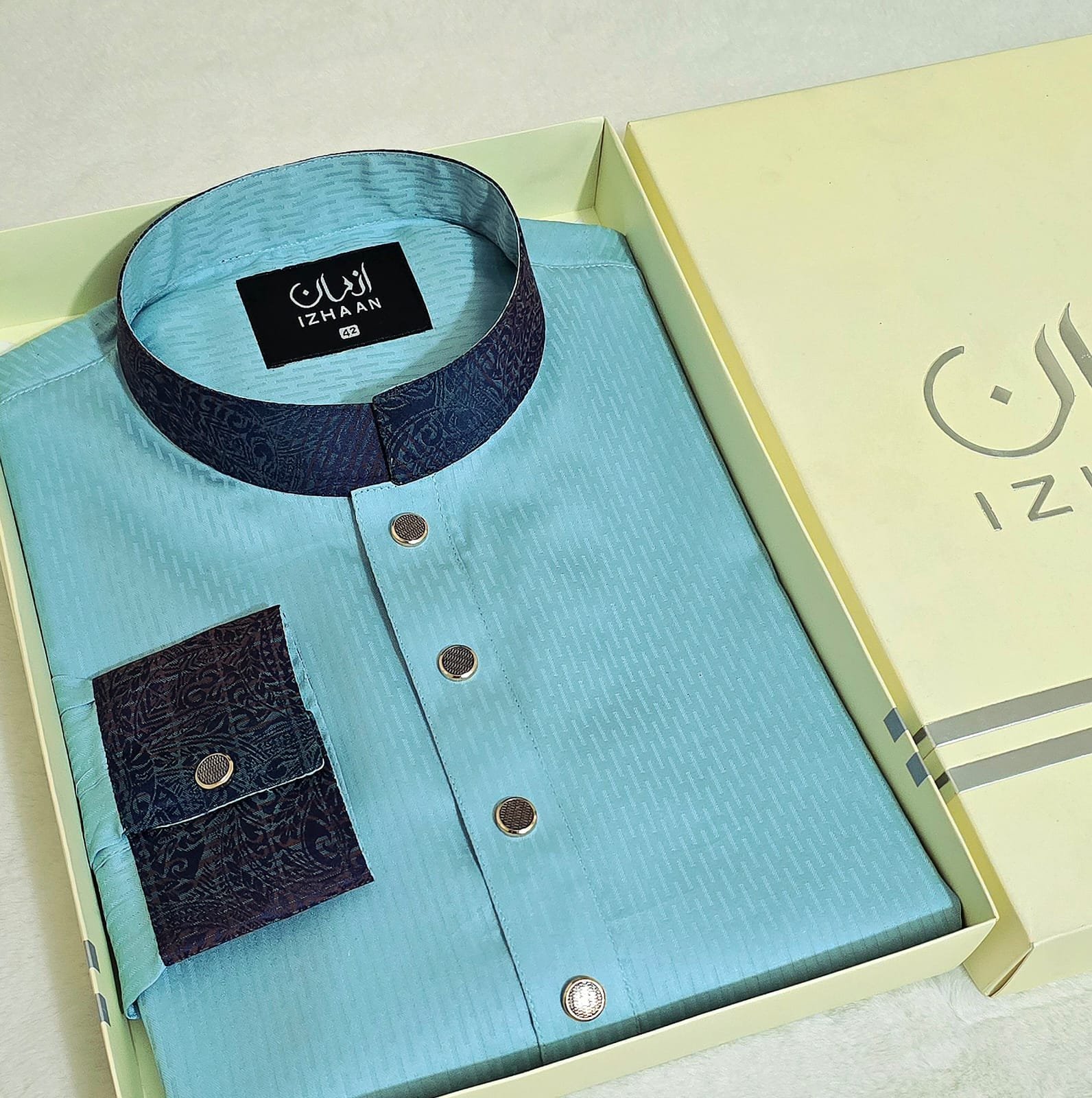 - Breathtaking embroidery embellishing the collar, upper chest, and cuffs