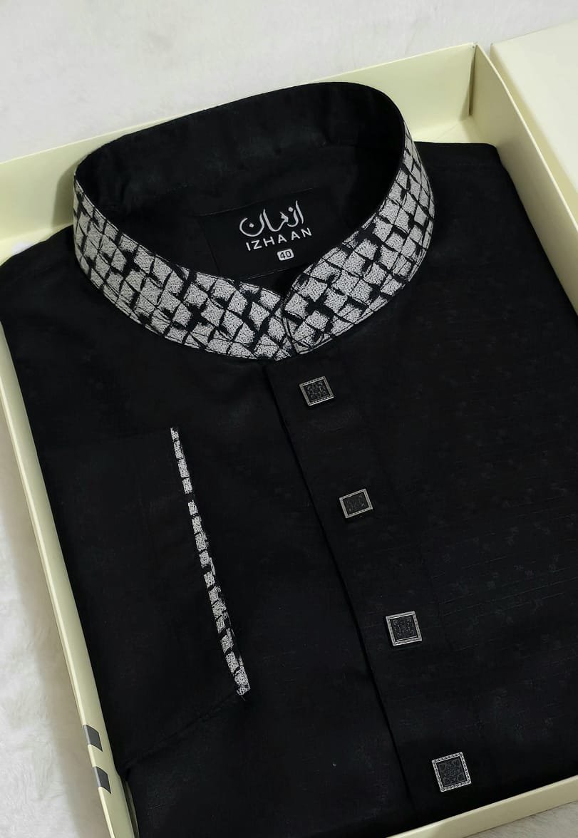 - Breathtaking embroidery embellishing the collar, upper chest, and cuffs