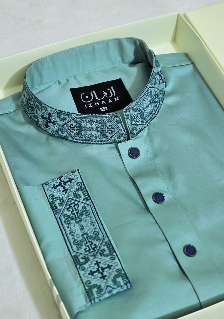 - Breathtaking embroidery embellishing the collar, upper chest, and cuffs