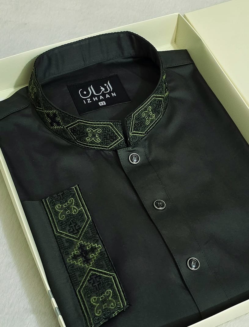 - Breathtaking embroidery embellishing the collar, upper chest, and cuffs