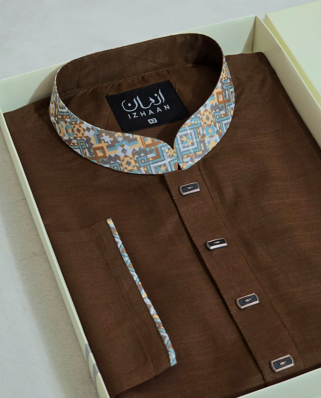 - Breathtaking embroidery embellishing the collar, upper chest, and cuffs