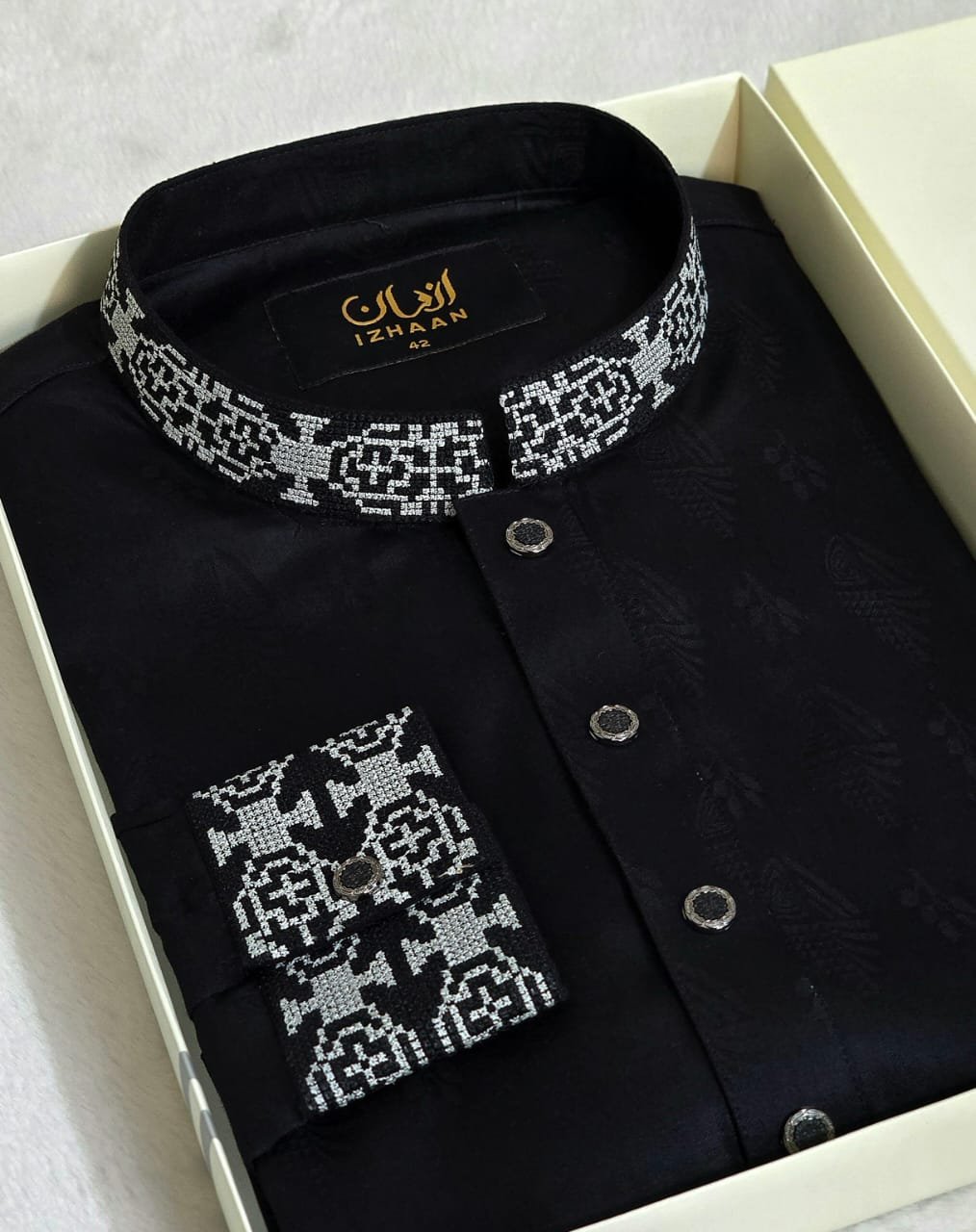 - Breathtaking embroidery embellishing the collar, upper chest, and cuffs