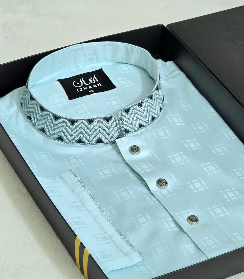 - Breathtaking embroidery embellishing the collar, upper chest, and cuffs