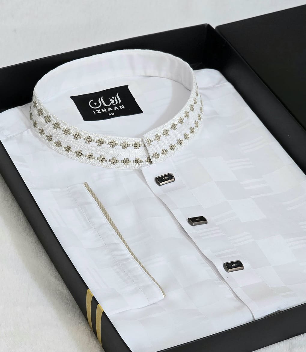 - Breathtaking embroidery embellishing the collar, upper chest, and cuffs