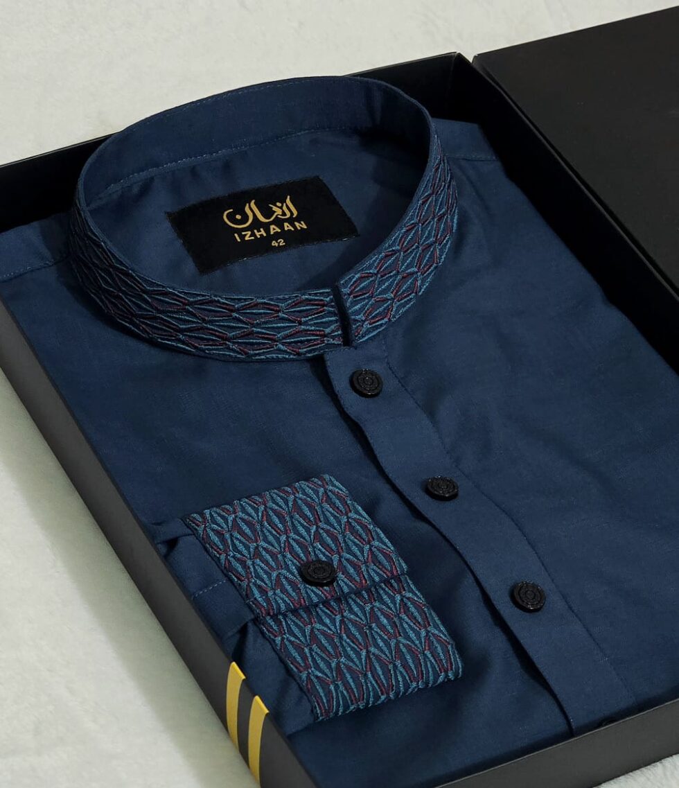 • Breathtaking embroidery embellishing the collar, upper chest, and cuffs