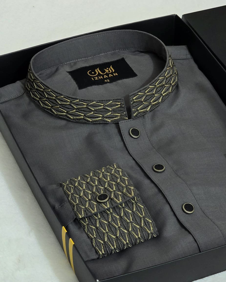 - Breathtaking embroidery embellishing the collar, upper chest, and cuffs