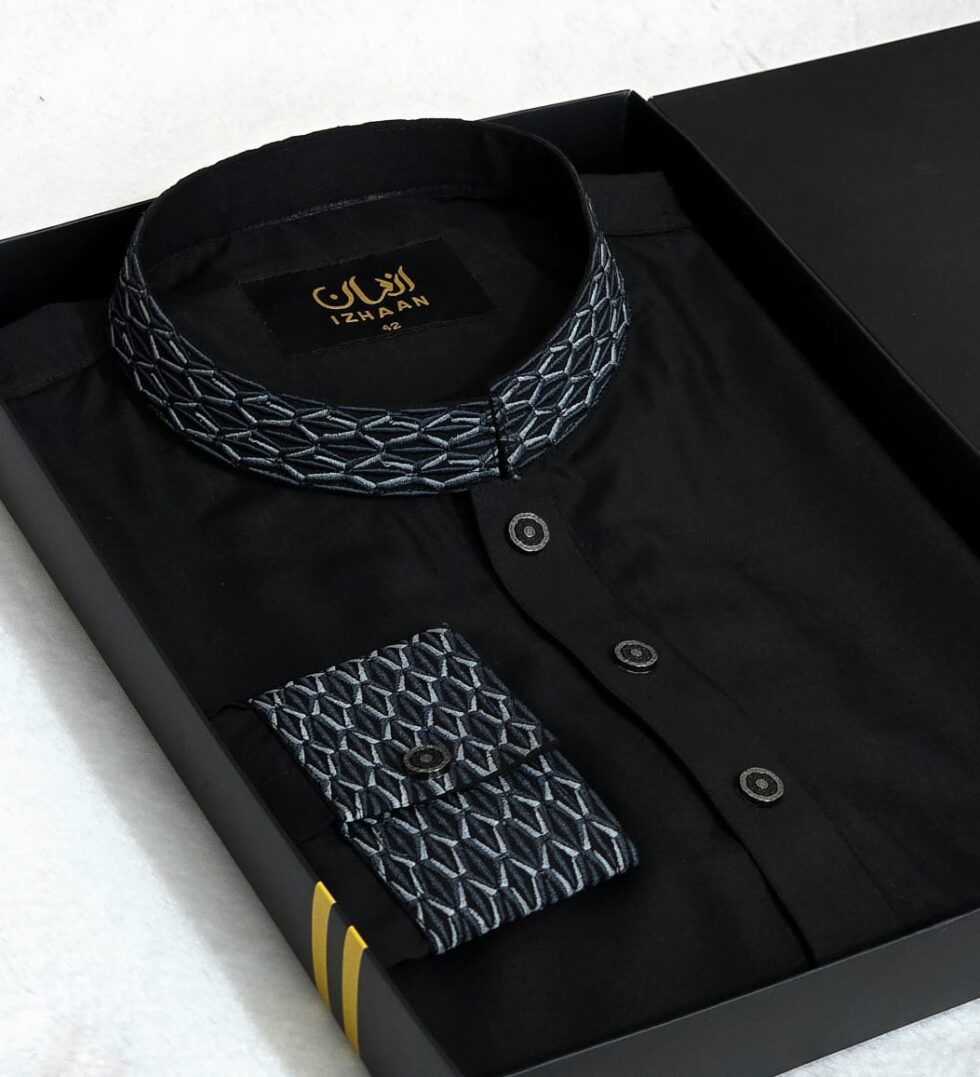 • Breathtaking embroidery embellishing the collar, upper chest, and cuffs