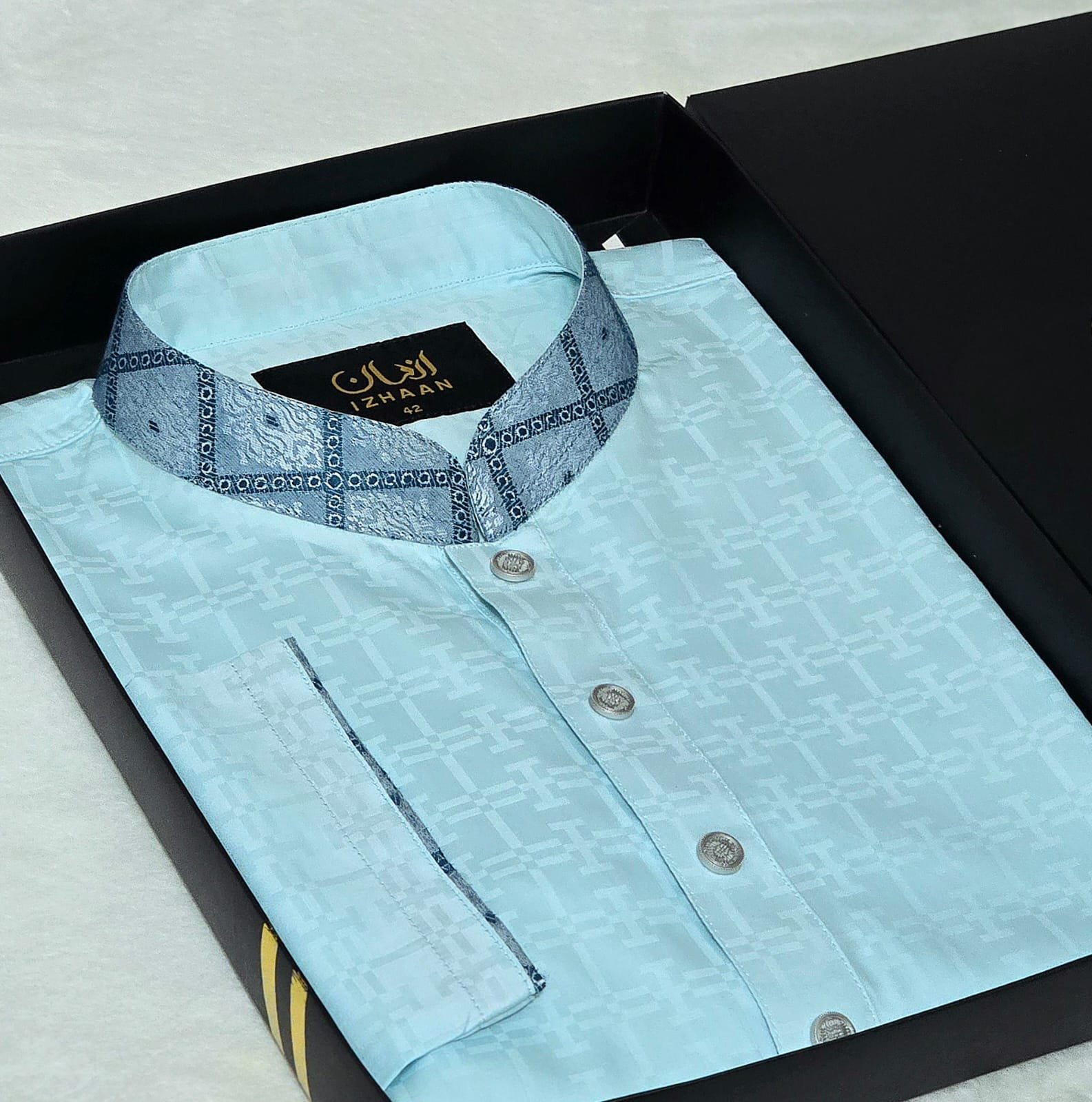 - Breathtaking embroidery embellishing the collar, upper chest, and cuffs
