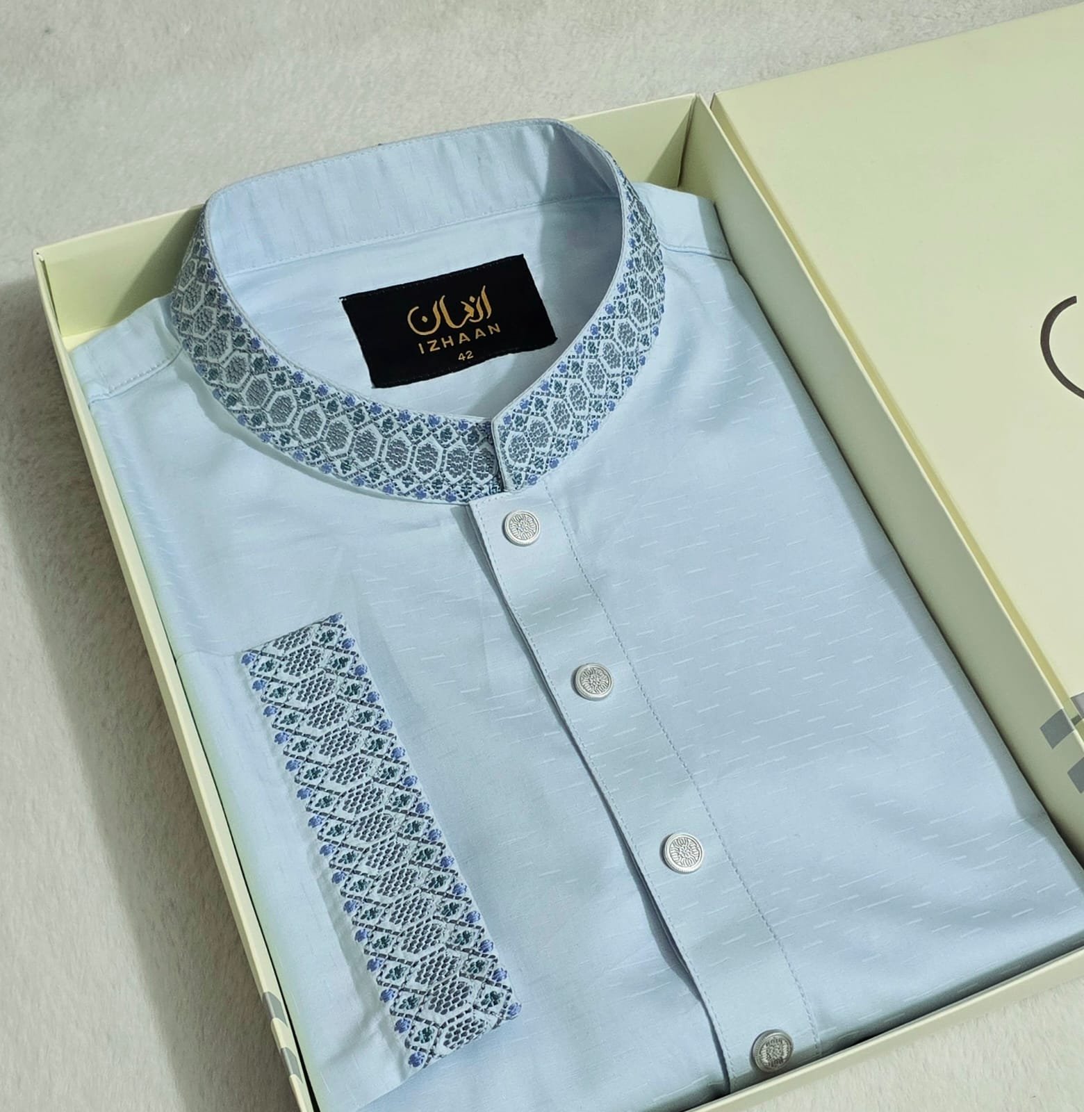 - Breathtaking embroidery embellishing the collar, upper chest, and cuffs