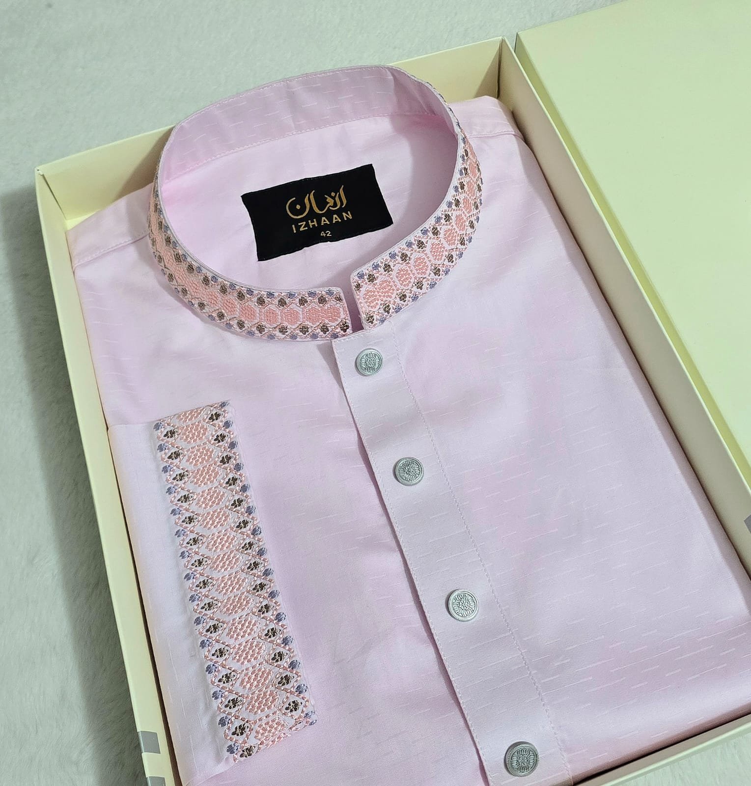 - Breathtaking embroidery embellishing the collar, upper chest, and cuffs