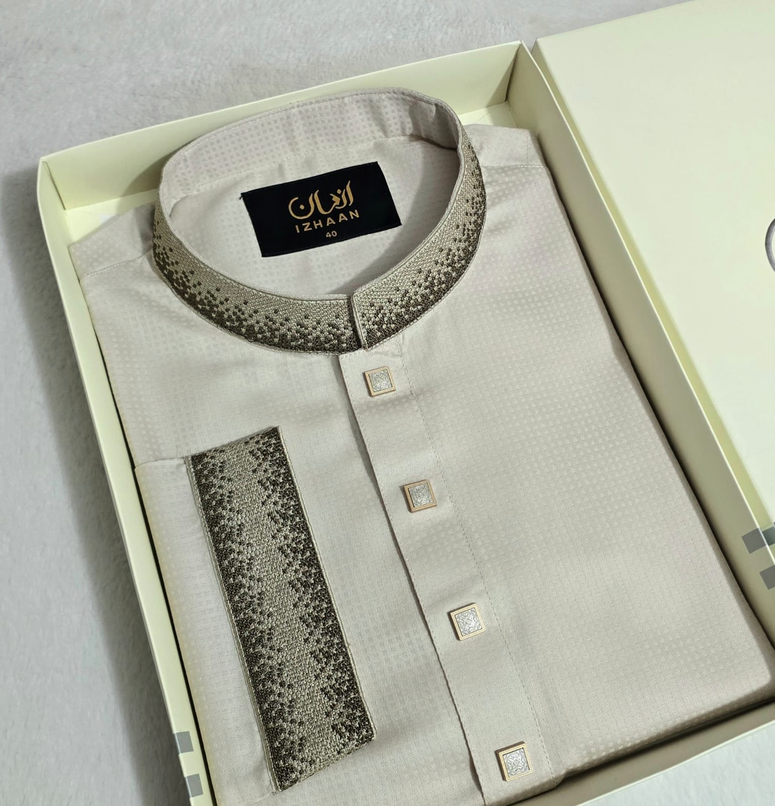 - Breathtaking embroidery embellishing the collar, upper chest, and cuffs
