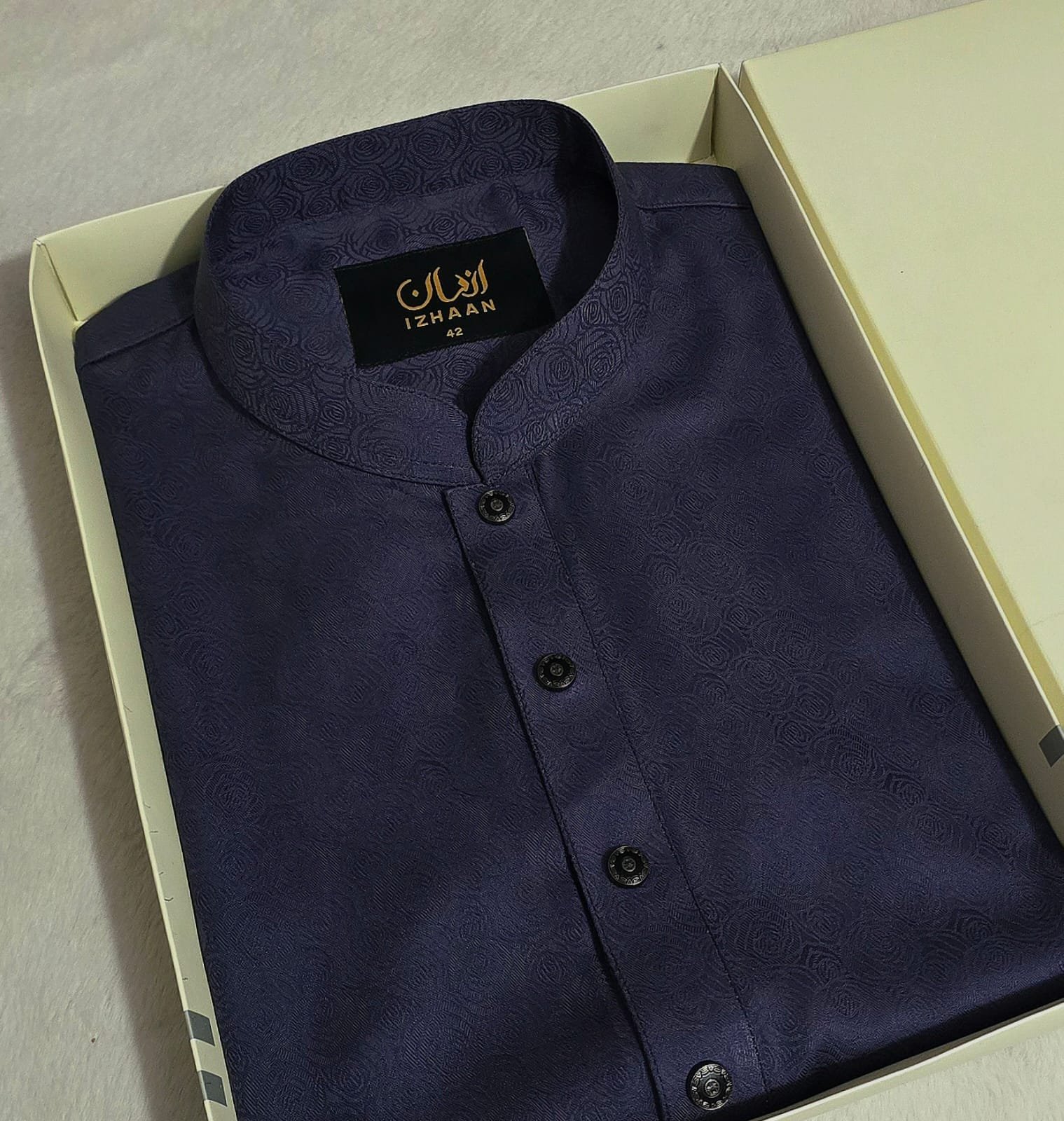 - Breathtaking embroidery embellishing the collar, upper chest, and cuffs