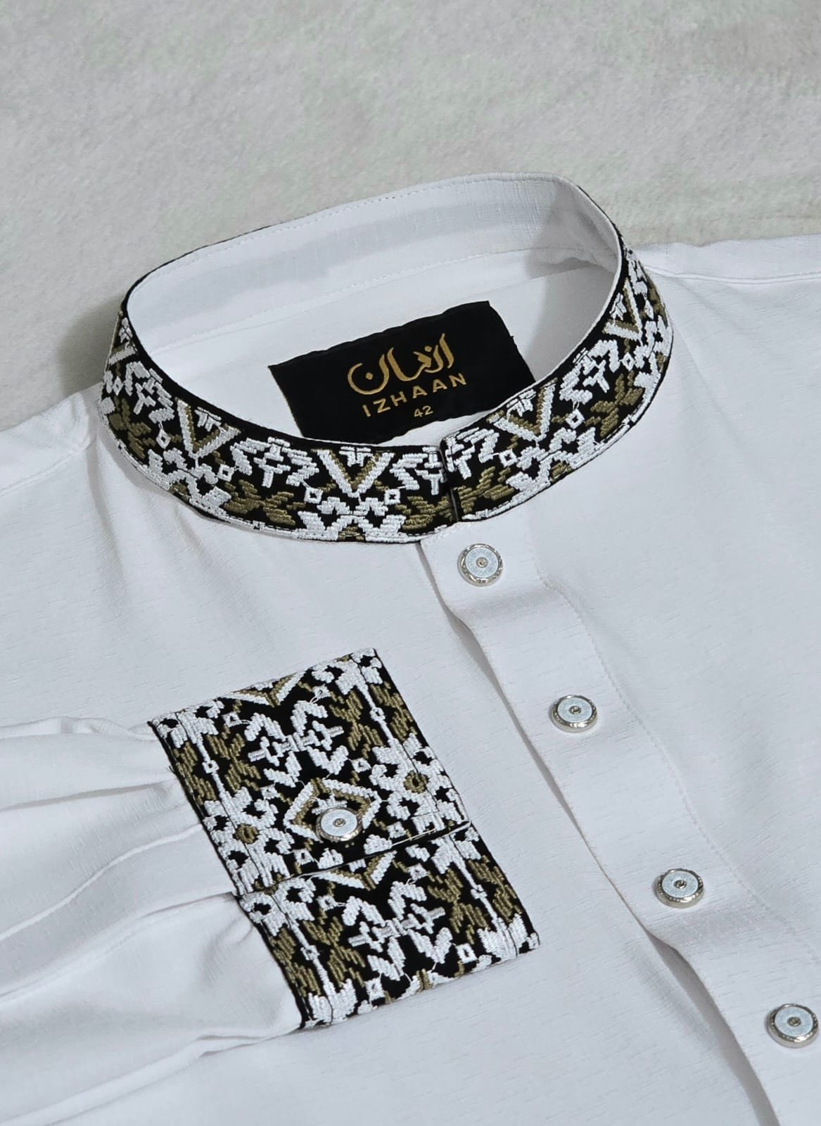 • Breathtaking embroidery embellishing the collar, upper chest, and cuffs