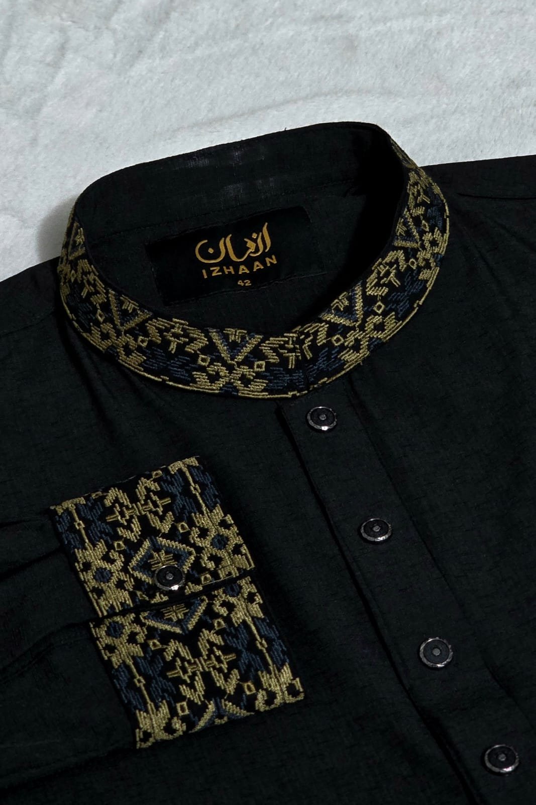 • Breathtaking embroidery embellishing the collar, upper chest, and cuffs