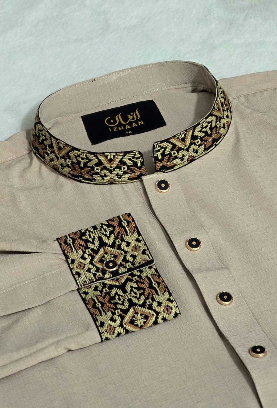 • Breathtaking embroidery embellishing the collar, upper chest, and cuffs
